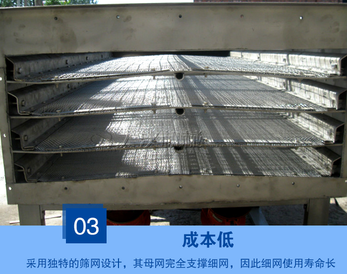 作為為常見(jiàn)的一種振動(dòng)篩,采用獨(dú)特的篩網(wǎng)設(shè)計(jì),其母網(wǎng)完全支撐細(xì)網(wǎng),因此細(xì)網(wǎng)使用壽命長(zhǎng),降低了細(xì)網(wǎng)的耗材使用,長(zhǎng)時(shí)間的生產(chǎn)可降低諸多成本,方便和快速更換篩網(wǎng) 。