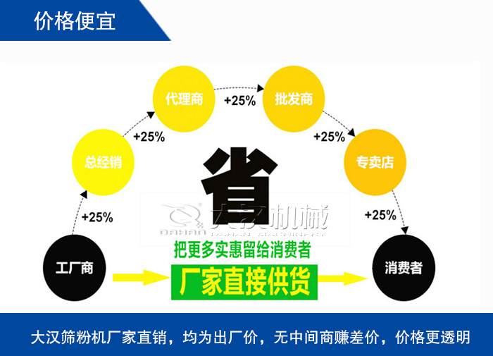 大漢篩粉機廠家直銷,均為出廠價,無中間商賺差價,價格更透明,而且我們公司位于河南省新鄉(xiāng)市,設(shè)備的生產(chǎn)成本和運輸成本普遍較低,所以可以節(jié)省大量的資金浪費,篩粉機價格更便宜。